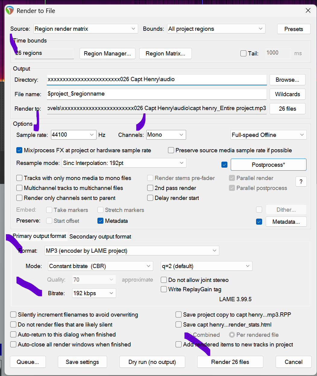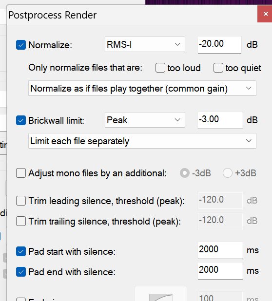 The rule says between 1 and 5 second of silence (“room tone”) at the beginning and end of each chapter (file). I go with 2 because it is between 1 and 5 (duh). 2 seconds is 2000 milliseconds. You’ll see in the illustration that Reaper lets me add “Pad start/end with silence: 2000 ms”