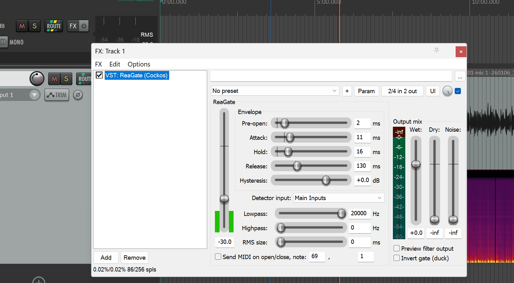 What is very cool about this is that you can play your book with the ReaGate working. Before adding levels you can play a second and see how it looks with the dancing green bars.