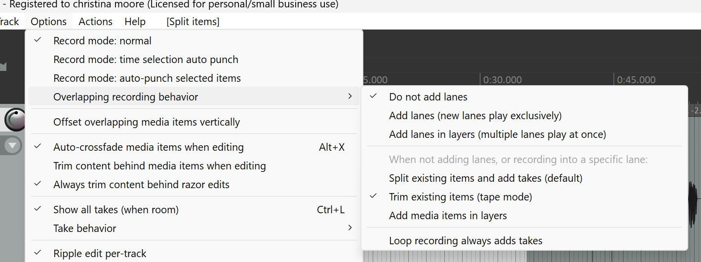 Reaper, by defaults, wants to preserve every utterance. It will create new “takes” on a whim. I find them annoying and they generate clutter. Yuck.